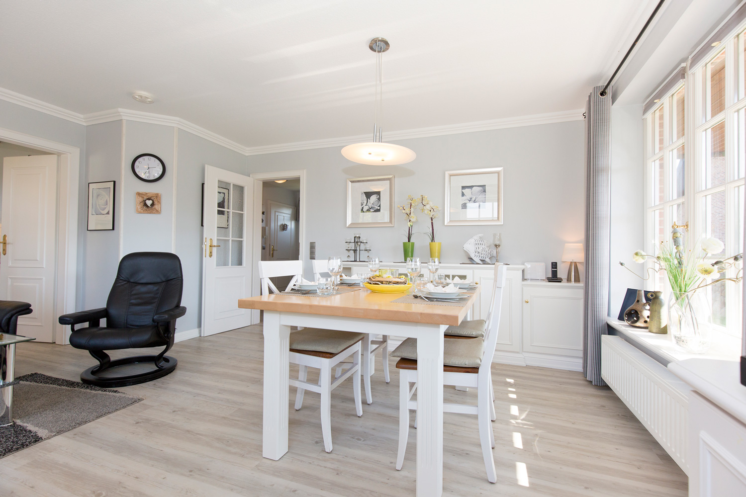 Im lichtdurchfluteten Wohnbereich stehen Ihnen hochwertige schwarze Ledermöbel zu Verfügung. Zwei originale Stressless-Sessel die Gäste der FeWo entspannen. Mit der technischen Ausstattung aus Smart TV, Blue-Ray-Player, Internetradio und Stereoanlage kann man entspannte Pausen von Urlaubsaktivitäten einlegen und fühlen sich dabei stets wie zu Hause.
