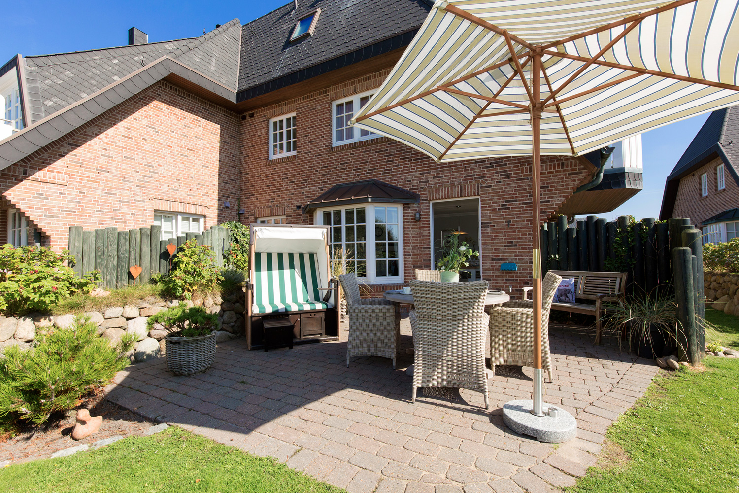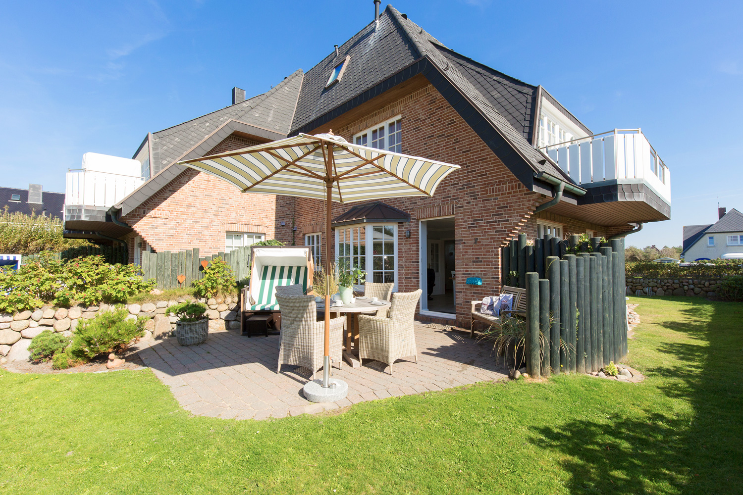 Auf der großen Südwest-Terrasse stehen schöne Korbsessel an einem großen, runden Tisch. Unter dem Sonnenschirm lässt es sich hier beim Frühstück unter freiem Himmel sehr gut aushalten. In einem grünweißen Starndkorb können Sylt-Urlauber es gemütlich machen und das Reizklima an der Nordsee auskosten, während die Kleinen den Garten "unsicher" machen. Eine zweite Terrasse am Ende des Gartens erlaubt es Ihnen zu jeder Tageszeit, ein Sonnenbad zu nehmen.