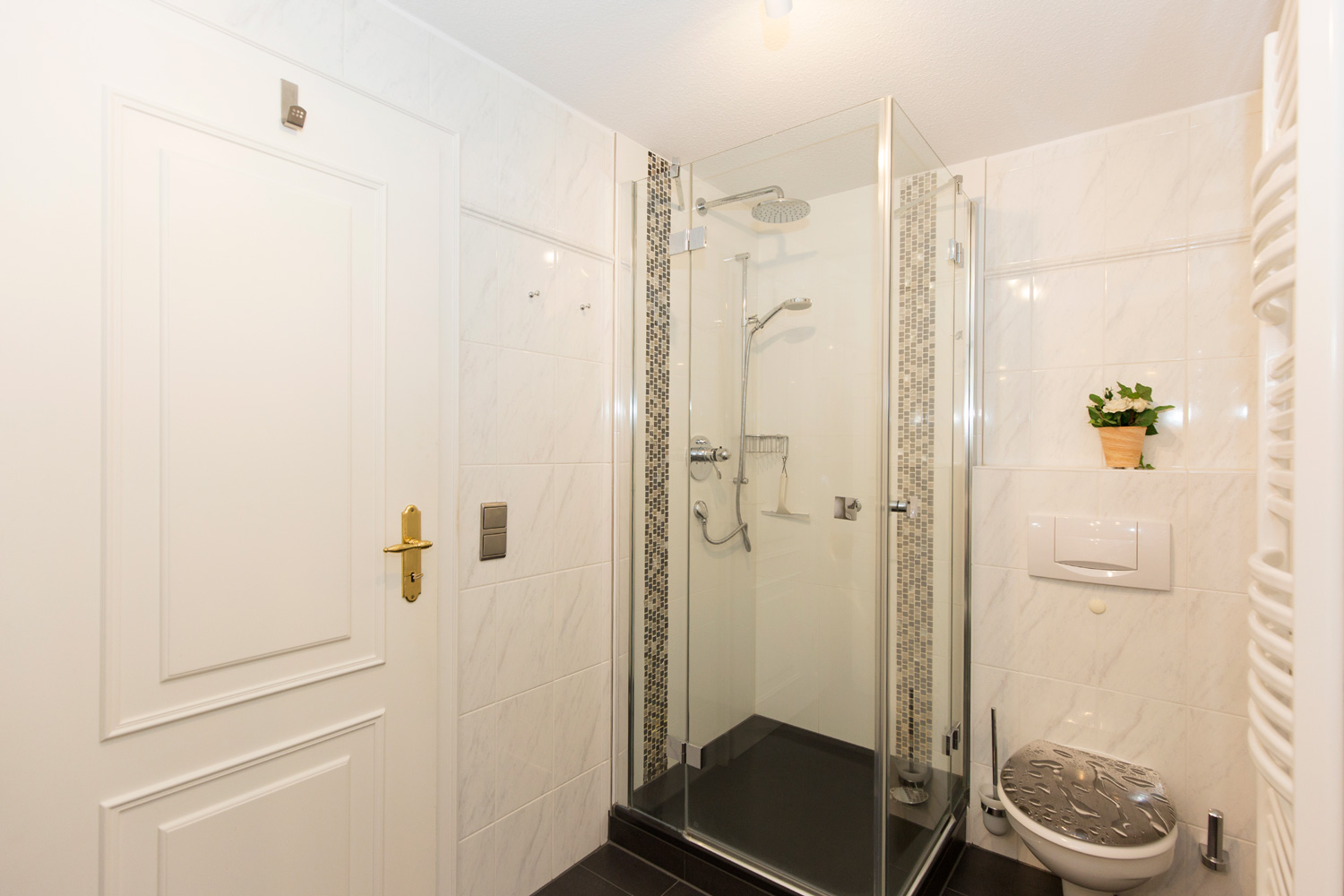 Das große, moderne Badezimmer mit Fenster verfügt über eine große Dusche mit Wasserfallduschkopf, WC, Bidet, Waschtisch mit Unterschrank, Fußbodenheizung und Badheizkörper (Handtuchtrockner).