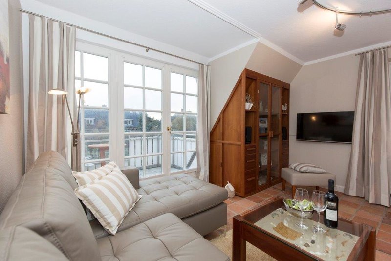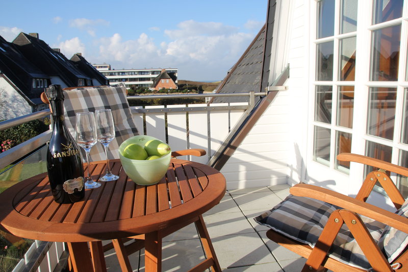 Auf dem sonnenreichen Süd-West Balkon erwartet Sylt-Urlauber ein gemütlicher Strandkorb. Hier kann man sich ich zurücklehnen und den Blick auf die Nordsee genießen. Die Gartenmöbel laden zu geselligen Abenden ein. Hier kann man gemütlich mit einem Frühstück unter freiem Himmel in den nächsten Urlaubstag starten.