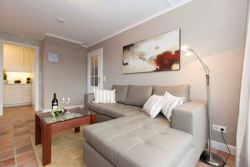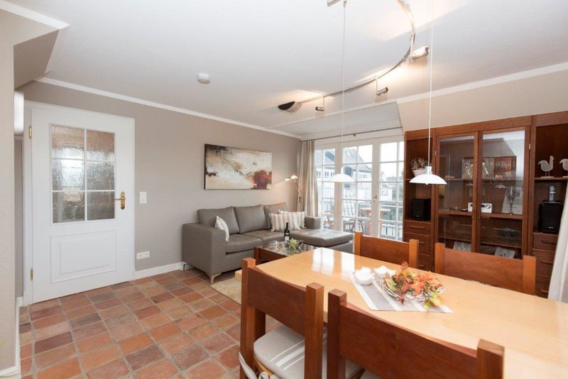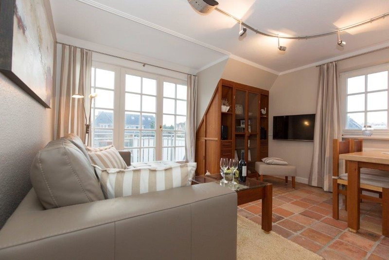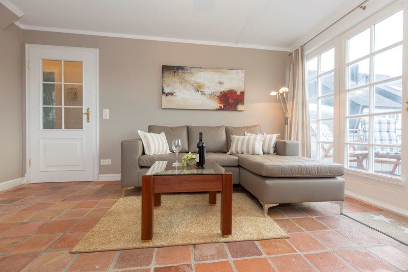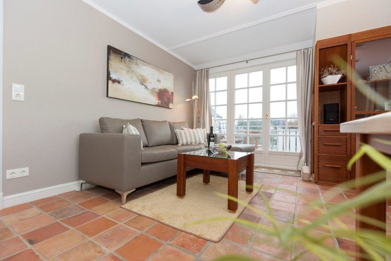 Der Wohnbereich ist geprägt von warmen Farben. Moderne und gemütliche Möbel garantieren für Ihr Wohlbefinden, hier können die Gäste der Ferienwohnung relaxen und entspannen. Durch die großen Fensterfronten fällt viel Licht in den Wohnbereich. Die technische Ausstattung wie Smart TV komplementiert die Wohlfühlatmosphäre, hier kann man sich mit den Liebsten auch mal auf die Couch fallen lassen und einem medialen Unterhaltungsprogramm folgen. WLAN und Telefon im deutschen Festnetz können kostenlos genutzt werden.